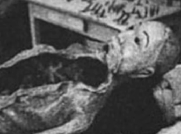 Zu Hause angekommen, präpariert er den Körper mit Kleiderbügeln, Glasaugen und Stricken. Um die verwesende Haut zu ersetzen, benutzt er Seide, die er mit Wachs und Gips verstärkt.