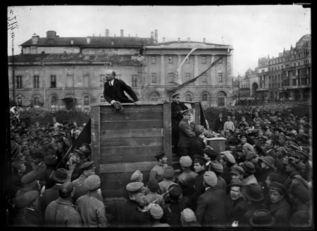 5. Mai 1920: Lenin spricht auf dem Sverdlov-Platz in Moskau zu den Truppen vor deren Einsatz an der polnischen Bürgerkriegsfront. In den frühen 1920er-Jahren konnte dieses Foto noch wie hier gezeigt mehrfach erscheinen.
