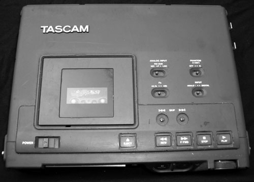Aufnahmegerät „TASCAM“. Herstellungsdatum 1989; Akkuleistung bei Aufnahme 90 Minuten; Maße: 18 cm x 24 cm x 5 cm; Gewicht: 1.514 Gramm