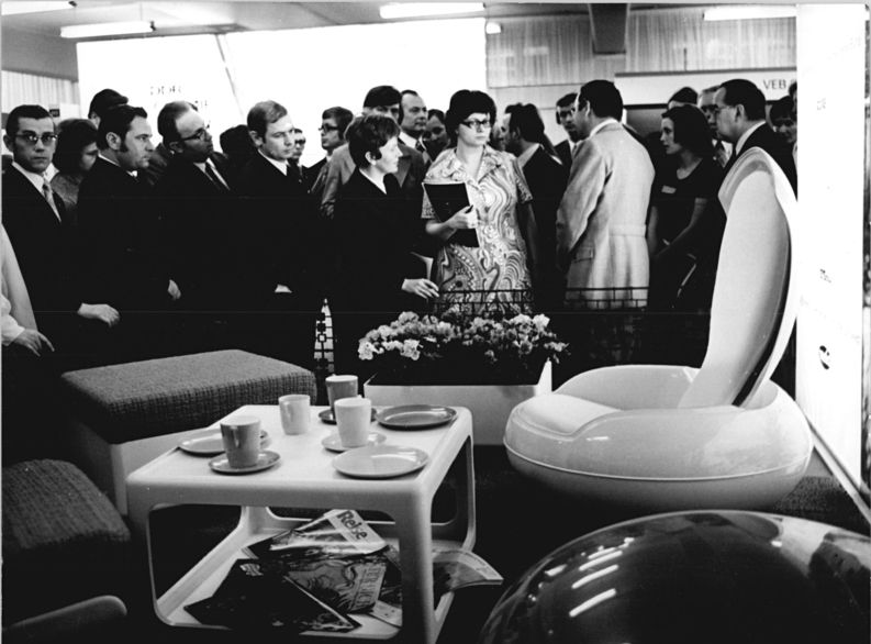 rechts im Bild das »Senftenberger Sitzei«. Der als Gartenmöbel gedachte Kunststoff-Sessel, entworfen vom in der Bundesrepublik lebenden ungarischen Designer Peter Ghyczy, wurde in der DDR für ein westdeutsches Unternehmen hergestellt; auf den ostdeutschen Markt gelangten nur rund 1.000 überzählige oder fehlerhafte Exemplare.