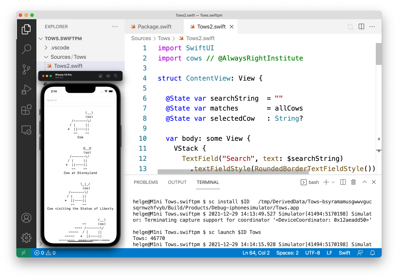 This is an updated version of SwiftUI Tools w/ VisualStudio Code using the new Swift support for Visual Studio Code, which is an updated version of SwiftUI Tools w/ just SwiftPM.