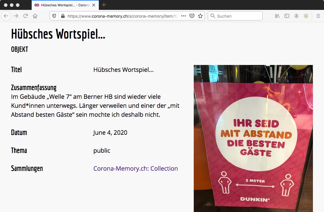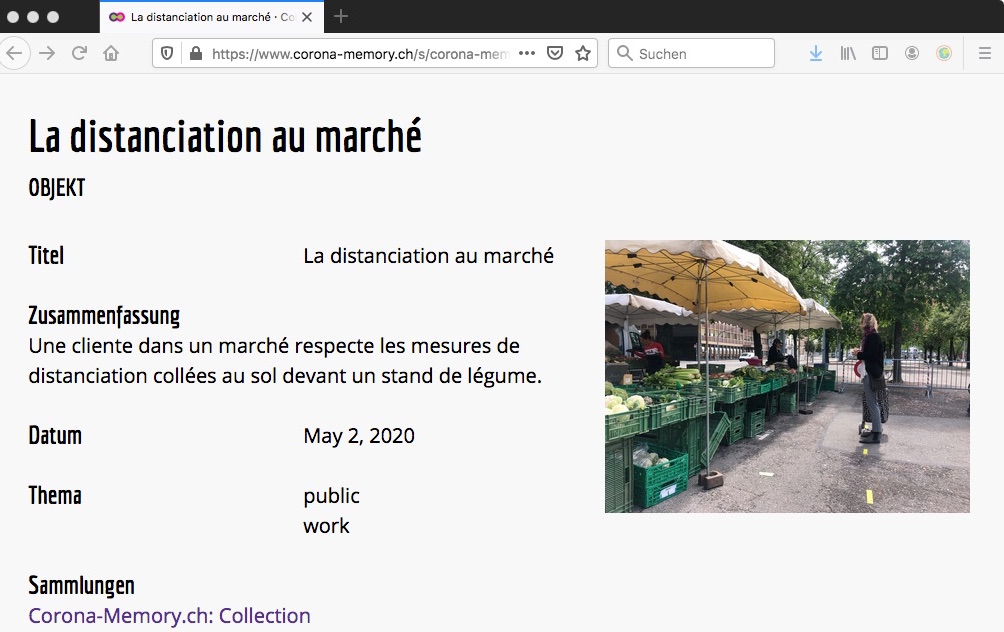 In der Schweiz ist das Sozialarchiv entsprechend seinem Sammelauftrag an diesen Aktivitäten führend beteiligt (vgl. SozialarchivInfo 2/2020). So partizipiert es am Projekt corona-memory.ch, das Bilder, Texte, Videos und Posts von unterschiedlichen Social-Media-Kanälen zur Corona-Krise in der Schweiz zusammenzuträgt und archiviert. Das Archiv unter dem Lead der Digital Humanities der Universität Bern, des Geschichtsfachportals Infoclio und des Istituto di media e giornalismo der Università della Svizzera italiana ist partizipativ angelegt. Die mit OMEKA-S erstellte Oberfläche erlaubt es, Beiträge hochzuladen, auf externe Blogs, Tweets und Posts zu verlinken und die metadatierten Beiträge anderer zu recherchieren und anzuschauen. So können Geschichten, Erinnerungen und individuelle Erfahrungen in Form von Videos, Bildern, Audios, schriftlichen oder akustischen Nachrichten mit der Mitwelt geteilt und der Nachwelt erhalten werden. Die dabei entstehenden Daten werden vom Sozialarchiv und vom Schweizerischen Bundesarchiv längerfristig aufbewahrt. Corona-memory.ch leistet damit nicht nur einen wichtigen Beitrag zum kollektiven Gedächtnis der Corona-Krise, sondern es ist auch ein konzeptueller und technischer Prototyp für die in der Archivwelt zurzeit intensiv diskutierte Archivierung von Social Media.