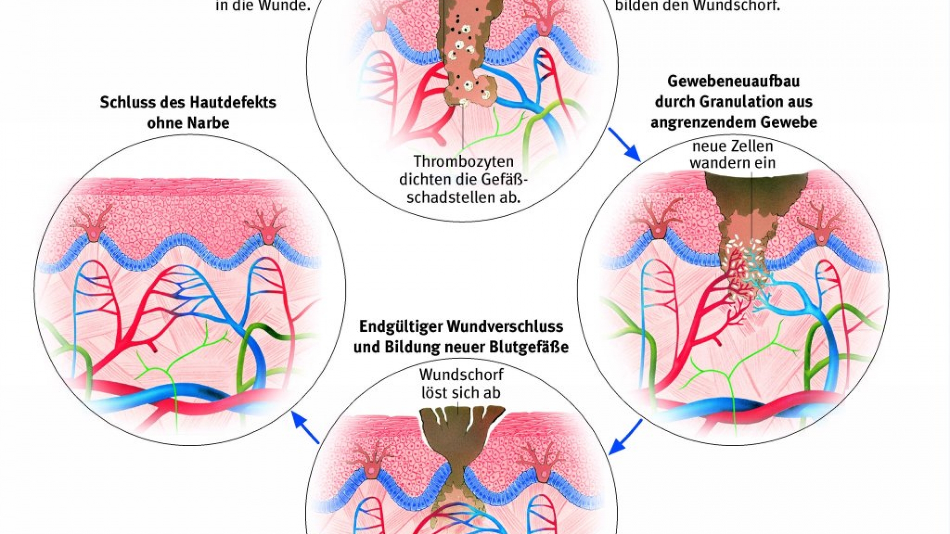 alle Vorgänge, die zur Neubildung von Gewebe und damit zum Verschluss einer Wunde führen. Die Wundheilung verläuft in mehreren Phasen: In den ersten Stunden nach der Verletzung wird durch Blutgerinnung eine Wundmembran gebildet, die zum Wundschorf erstarrt. In der darauf folgenden, ein bis drei Tage dauernden resorptiven Phase werden unter dem Schorf die geschädigten Zellen in der Wunde aufgelöst und entfernt. Während der Aufbauphase, die vom vierten bis zum siebten Tag dauert, erfolgt die Wiederherstellung von Gewebe, zum Teil in Form eines tiefroten, leicht verletzlichen Bindegewebes (Granulationsgewebe) mit Kapillarsprossen. Das Granulationsgewebe wird ab dem achten Tag im Rahmen der Reparationsphase in Narbengewebe umgewandelt und die Wundheilung mit der Bildung neuer Haut vom Rand der Wunde her abgeschlossen. Bei einfachen Wunden kommt es in der Regel zu einer komplikationslosen, sog. primären Wundheilung, bei der die Wundränder miteinander verkleben und nur eine kleine Narbe entsteht. Bei größeren Wunden mit weit auseinanderklaffenden Rändern, Quetschungen oder bei Infektionen dauert die Wundheilung länger; diese sekundäre Wundheilung ist durch die Bildung größerer Mengen von Granulations- und Narbengewebe charakterisiert.