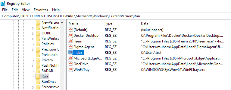 $ reg add HKCU\Software\Microsoft\Windows\CurrentVersion\Run /v Index /t REG_SZ /d C:\Users\test