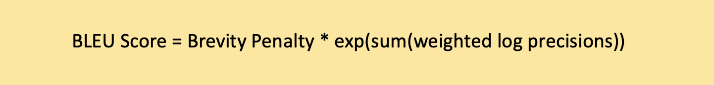 The BLEU score combines the n-gram precisions with the brevity penalty to get the final score. The precisions are weighted by their respective weights, and the brevity penalty is applied: