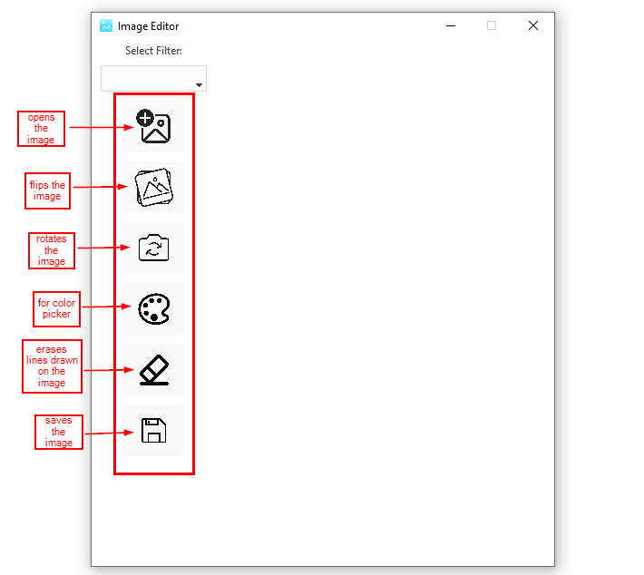 We will now create the Frame and the Canvas. The Frame will be placed on the left side of the window and it will contain the label, Combobox, and the four buttons. The Canvas will be on the right side of the window and it will display the image to be edited.